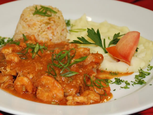 Peixe ao molho de camarão, arroz branco e purê de batatas